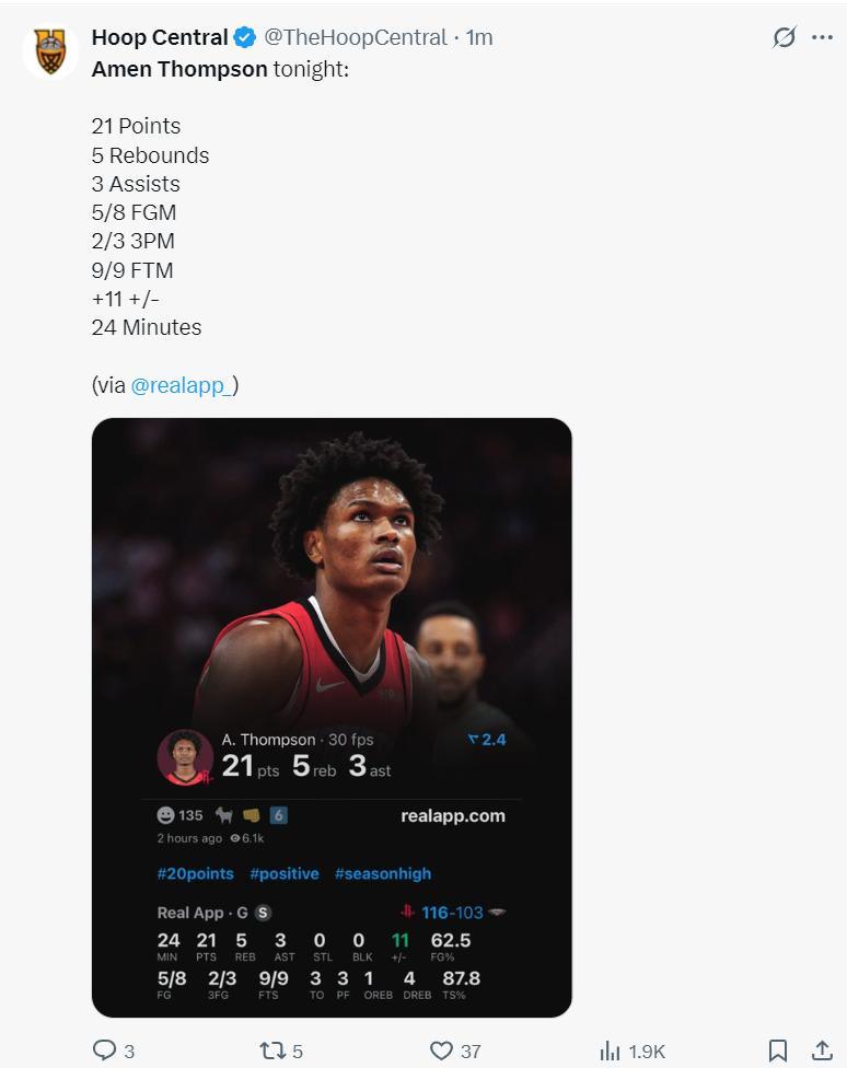 阿門全場比賽24分鐘,8中5,三分3中2,罰球9中9,拿到21分5籃板3助攻,命中率62.5%,三分命中率66.7%,真實命中率87.8%,正負值+11。