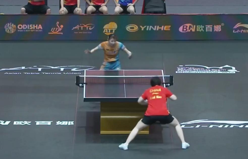 第三盤是蒯曼VS早田希娜,蒯曼是世界排名第四,早田希娜是世界排名14,這兩人首次在國際賽場相遇,很明顯邱貽可的排兵佈陣就是想利用左手將去剋制左手將,但第一局蒯曼很喫早田希娜的發球,而且蒯曼的發球效果不佳開場早田希娜一度7-4領先,蒯曼追到6-7,兩位左手將的首局蒯曼很被動,早田希娜10-7局點,首局蒯曼8-11輸掉。