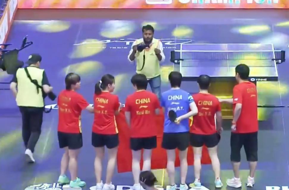 國乒奪冠大合影,孫穎莎、王曼昱將C位給了蒯曼,因爲蒯曼是絕殺的那個英雄球員,蒯曼這場比賽贏得非常漂亮。