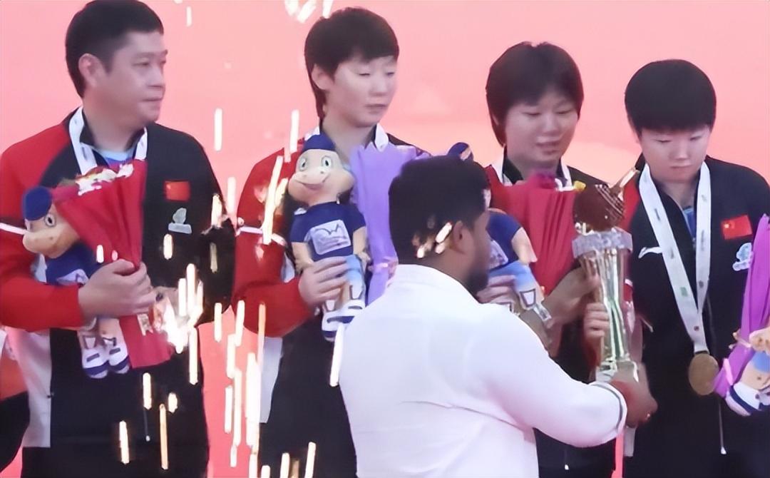 頒獎典禮上還出現了有趣的一幕,那就是孫穎莎與邱貽可“謙讓”獎盃,邱貽可指導示意獎盃給孫穎莎拿,小魔王則示意獎盃給邱貽可拿,可頒獎人執意要將獎盃給莎莎,最終莎莎只能卻之不恭了。