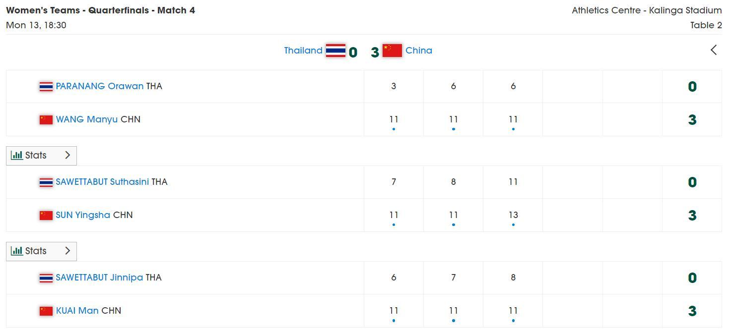 1/4決賽對陣泰國隊的比賽,中國隊派出的是王曼昱、孫穎莎、蒯曼,這三人都是3-0取勝,王曼昱3-0帕拉南、孫穎莎3-0素塔西尼-薩維塔布特、蒯曼3-0吉尼帕-薩維塔布特。