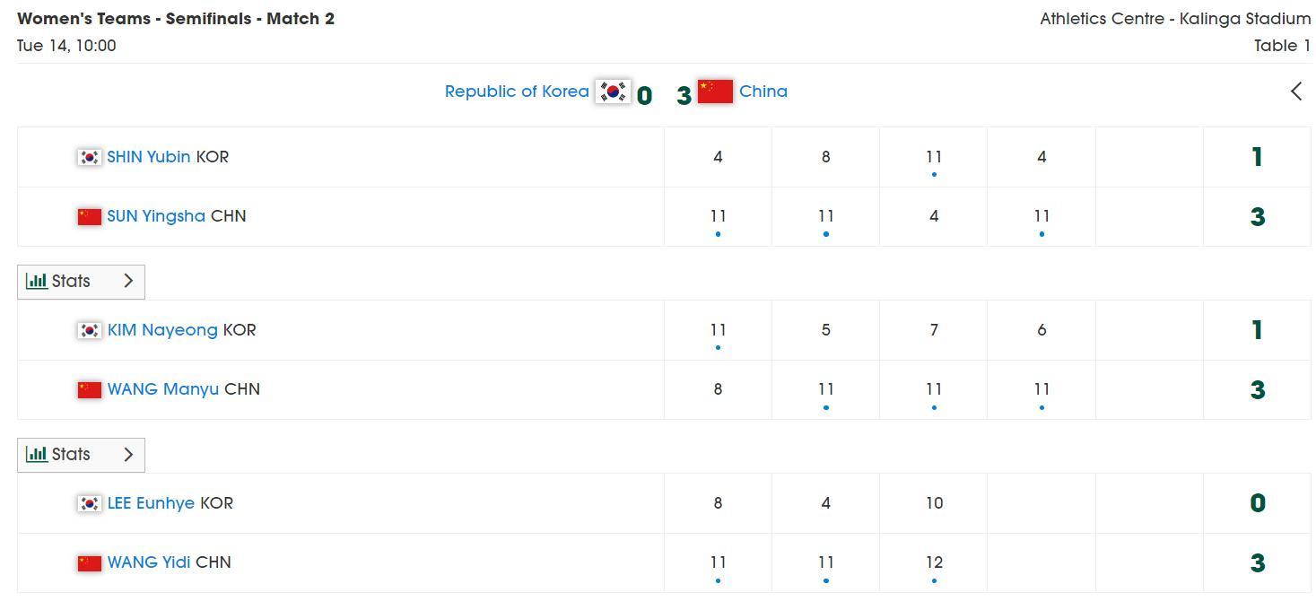 半決賽對陣韓國的比賽,中國隊派出的是孫穎莎、王曼昱、王藝迪,最終孫穎莎3-1申裕斌、王曼昱3-1金娜英、王藝迪3-0李恩惠;