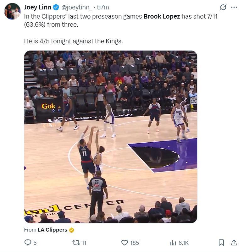 快船記者Joey Linn寫道:大洛最近這兩場季前賽,三分球11中7,三分命中率高達63.6%。