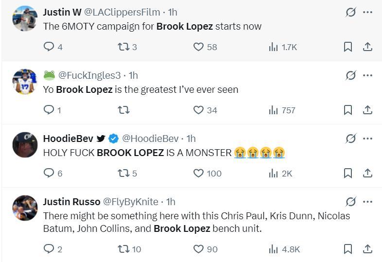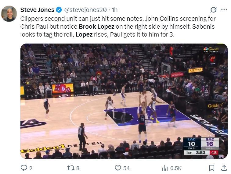 快船記者史蒂夫-瓊斯寫道:快船的第二陣容表現很不錯,科林斯爲保羅掩護,大洛去右側蹲着拉開空間,等小薩去協防保羅後,保羅甩出來給大洛三分命中。