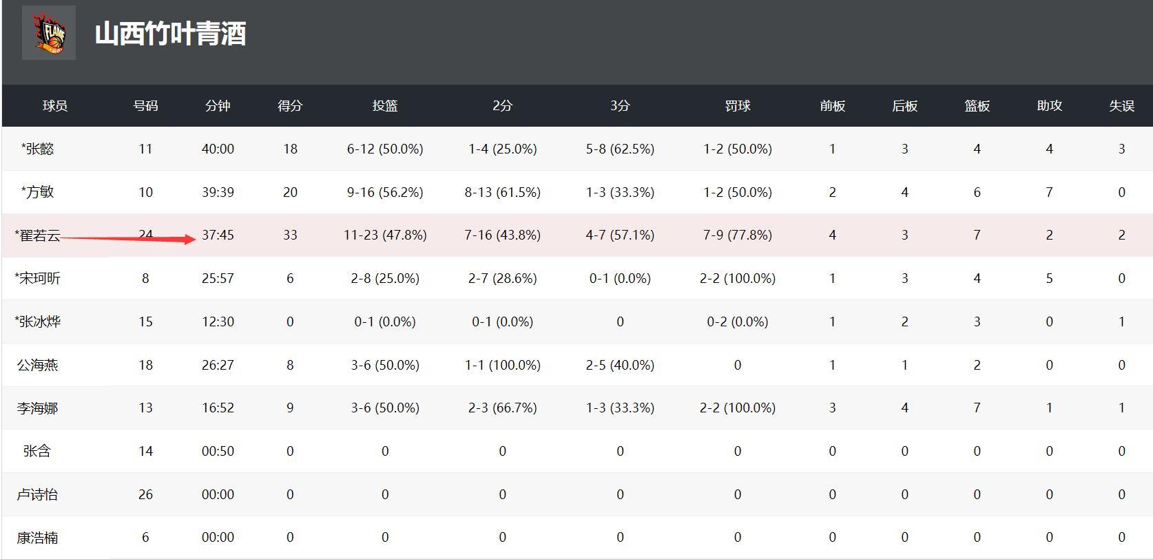 很明顯發揮最好的當屬翟若雲,她全場比賽23中11,三分7中4,拿到33分7籃板2助攻1搶斷,命中率47.8%,三分命中率57.1%,翟若雲在末節一人狂攬11分,她就是山西女籃的絕對王牌。
