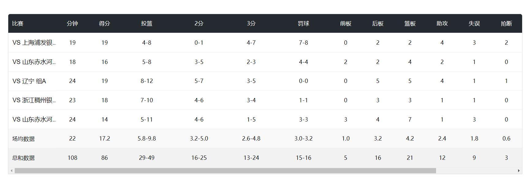爲什麼說羅欣棫是絕對的核心呢?江蘇女籃這5場比賽只有羅欣棫一人做到每一場比賽都得分上雙,場均22分鐘,拿到17.2分4.2籃板2.4助攻0.6搶斷0.2蓋帽,命中率59.1%,三分命中率54.1%,就算對陣山東女籃這場三分球5中1,羅欣棫的三分命中率還在五成以上!
