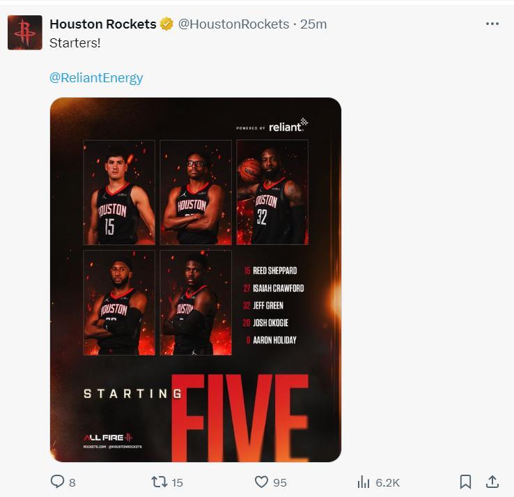 火箭:謝潑德、霍勒迪、奧科吉、格林、克勞福德;