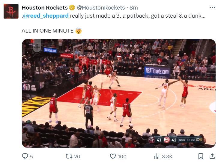 北京時間10月17日,NBA季前賽,火箭擊敗老鷹。這場比賽足以說明有足夠的球權、戰術地位謝潑德依舊可以成爲一支球隊的核心控衛,因爲他也有着頂級的傳球視眼、運動能力、投射天賦,謝潑德可以消除很多人的質疑了,全場比賽29+6+6+4+3。