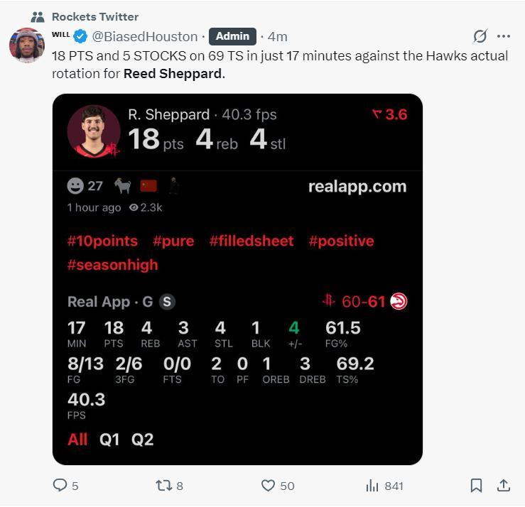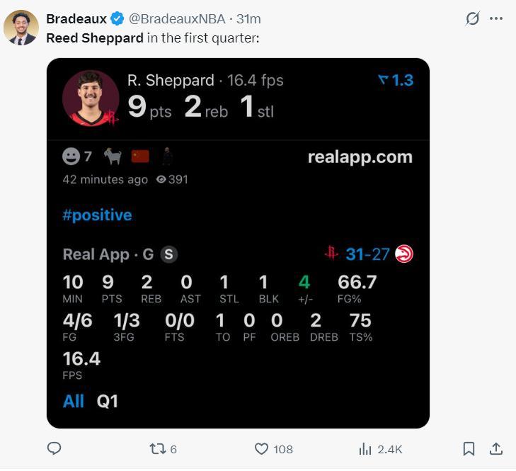 上半場打完謝潑德17分鐘,13中8,三分6中2,已經拿到18分4籃板3助攻4搶斷1蓋帽的完美數據,真實命中率69.2%。
