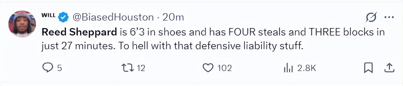 休媒:謝潑德穿鞋身高超過6尺3(1.91米),他在27分鐘裏3蓋帽4搶斷,別再說他防守端是個漏洞了。
