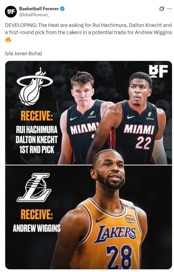 根據湖人記者約什-布哈的消息,熱火對威金斯的要價是湖人一個未來不保護的首輪籤、道爾頓-克內克特、八村壘,也就是要1換3,他們也真的要的出口。