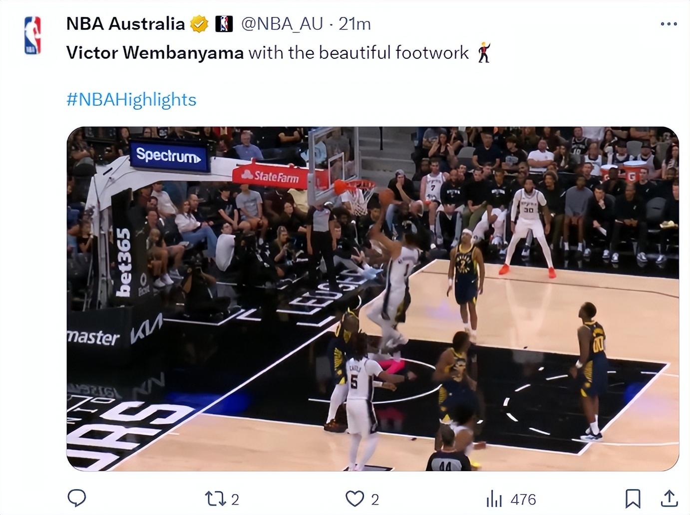 北京時間10月18日,聖安東尼奧馬刺VS印第安納步行者,這場比賽馬刺仍舊不是全主力出戰,福克斯、索漢、奧利尼克、比永博等人繼續作壁上觀,文班亞馬僅僅登場23分鐘就打卡,三節拿到17分12籃板1助攻1搶斷4蓋帽。