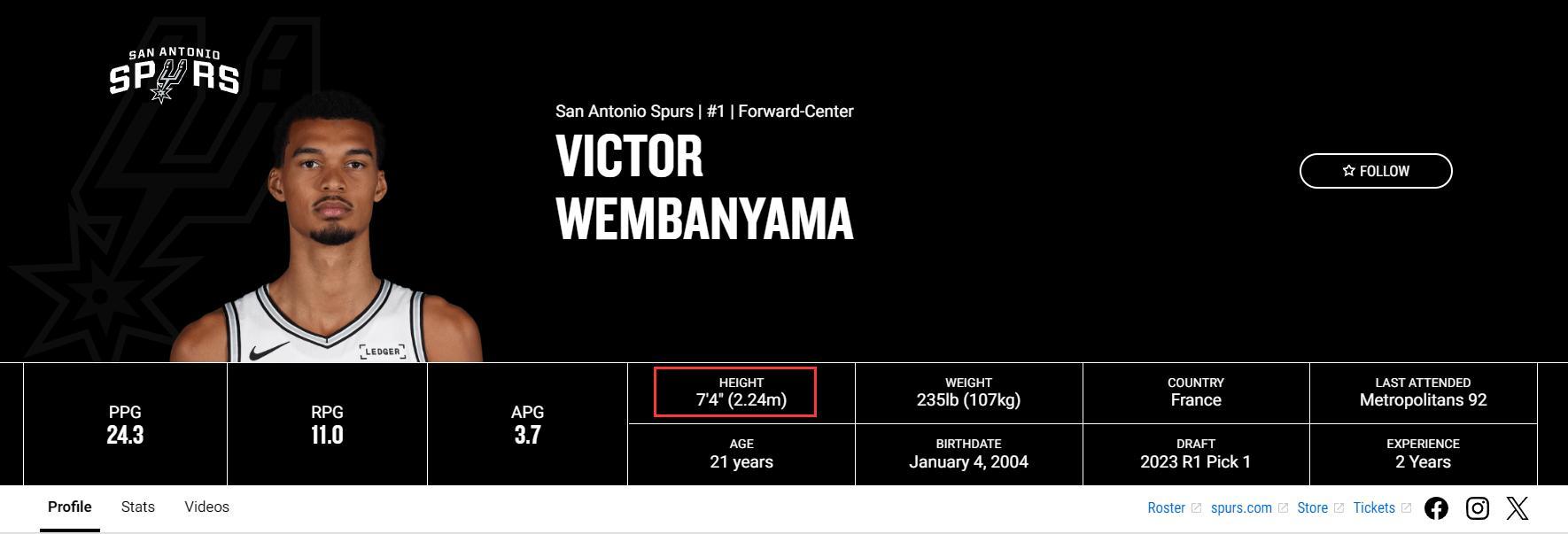 實際上NBA官方文班亞馬的身高數據根本沒有變過,還是7尺3(2.24米),文班亞馬怎麼可能一個夏天就長到2.31米,要知道他已經21歲了,又不是14-15歲。