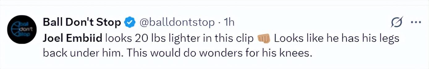 美媒:感覺恩比德減重了20磅,他的雙腿變得很有力量,這對於減輕膝蓋的壓力很有效。
