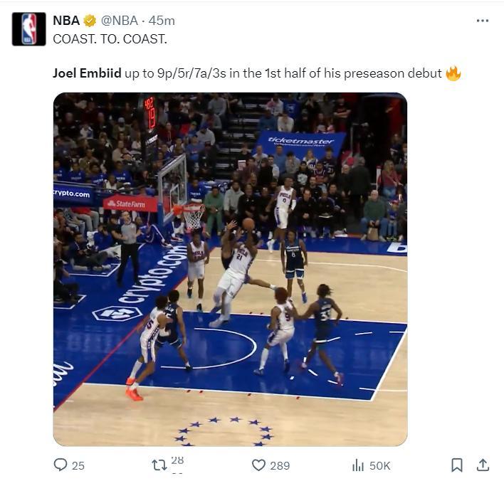 賽前ESPN記者蕾夢娜-謝爾伯恩就表示:恩比德的康復實際上超過了預期,他可以在新賽季開始前重返賽場對於費城來說是一個巨大的利好。
