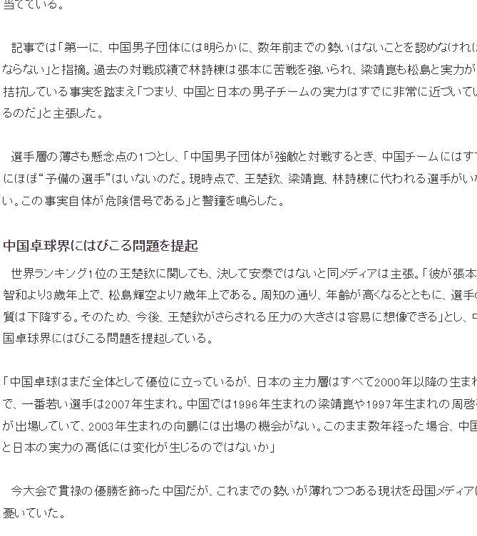 必須承認中國男團已經沒有前幾年的勢頭,就過去的戰績而言林詩棟面對張本智和總是陷入苦主,松島輝空也已經有實力與梁靖崑抗衡,中國男團的實力正在緩慢減退,而日本男團的年輕陣容在持續進步,中國幾乎沒有預備選手能替代王楚欽、梁靖崑、林詩棟。