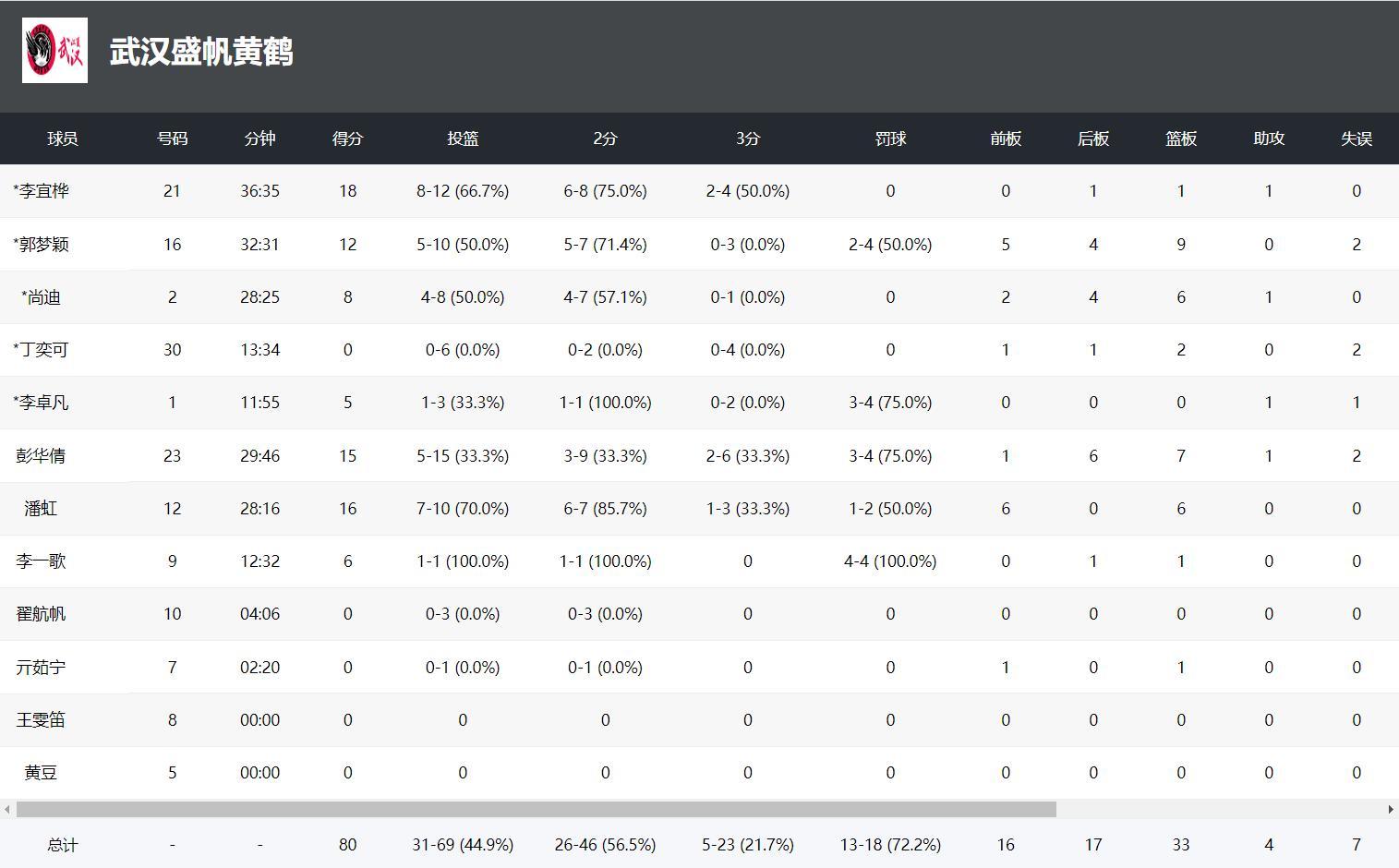 此役武漢女籃全隊4人上雙,李宜樺37分鐘,12中8+三分4中2,拿到18分1籃板1助攻;