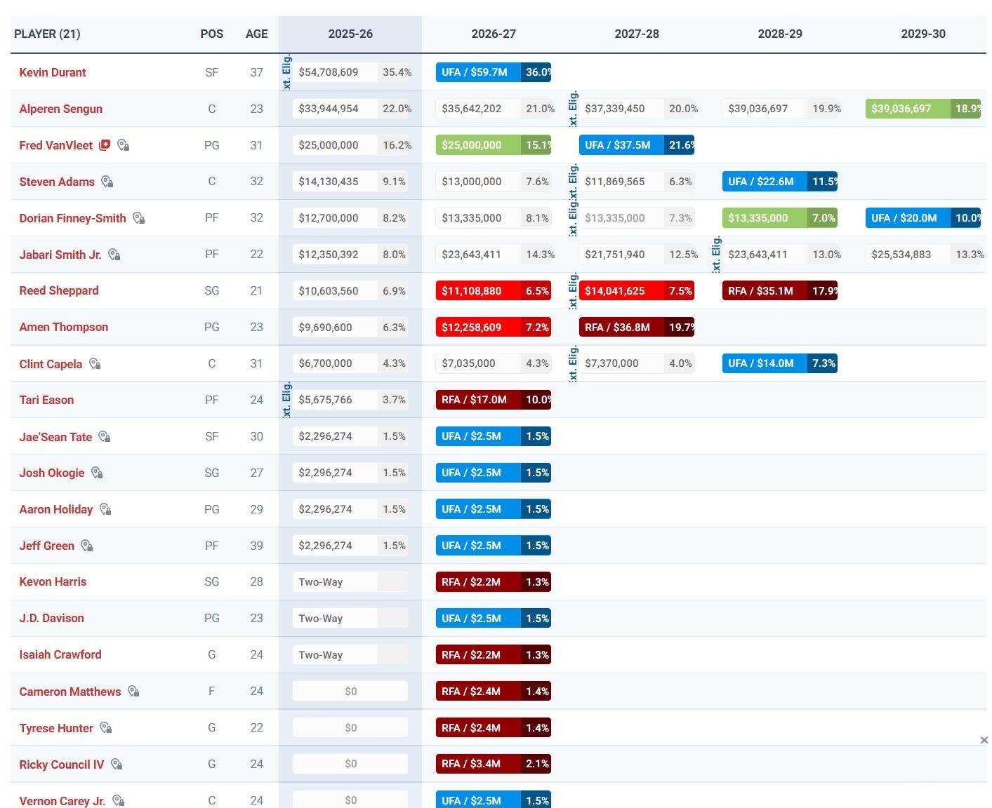 杜蘭特、申京、範弗利特(賽季報銷)、亞當斯、芬尼史密斯、小賈、伊森、謝潑德、奧科吉、阿門、卡佩拉、泰特、霍勒迪、傑夫格林;哈里斯、克利福德、戴維森(三個雙向合同)