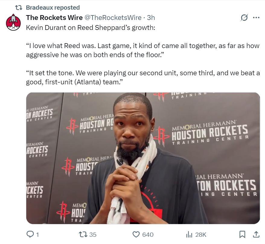 杜蘭特則談到了謝潑德的成長:我很喜歡裏德過去幾場比賽的感覺,上一場比賽他攻防兩端都展現出應有的統治力,他爲球隊奠定基調,我們派出2隊+3隊的陣容,他們擊敗了全主力出戰的亞特蘭大老鷹隊。