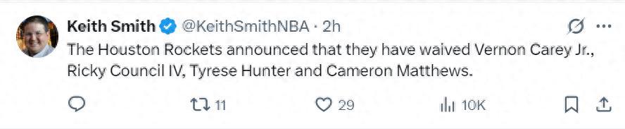 原本火箭隊訓練營是21人,裁掉這4位訓練營合同球員後火箭隊的大名單再度回到14+3名單:
