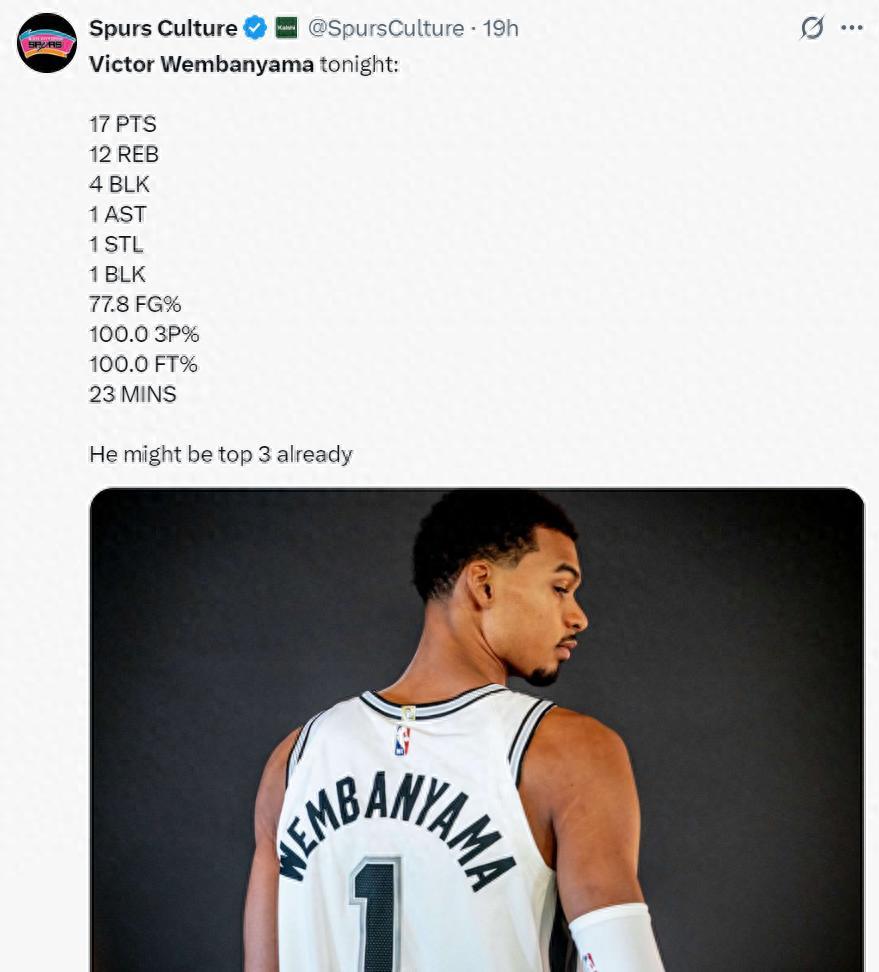 維克托-文班亞馬在上一場季前賽中,僅僅登場23分鐘,拿到17分12籃板1助攻1搶斷4蓋帽的華麗數據,健康的文班亞馬的確是聯盟中最強勢的攻防雙向球員。