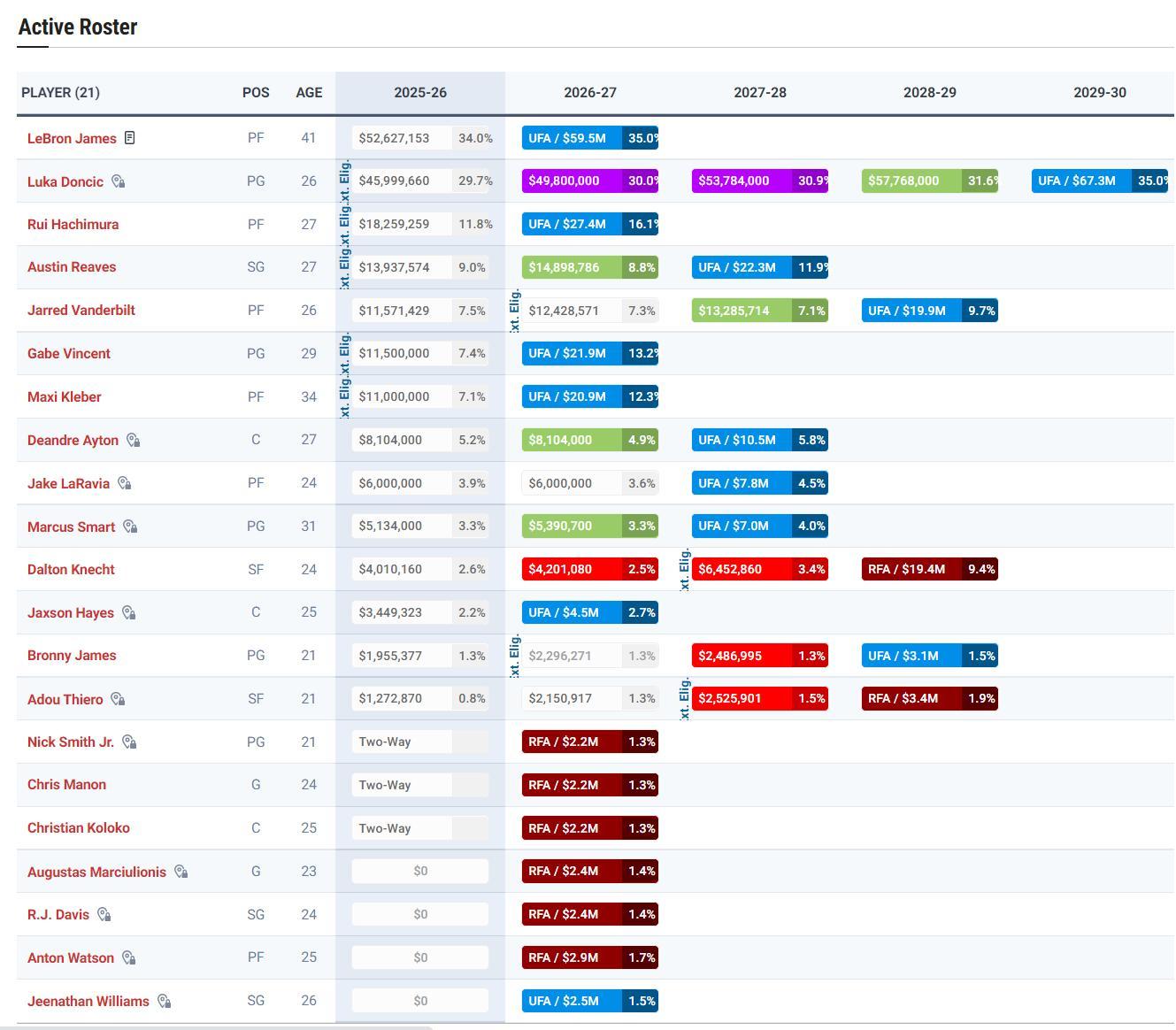 詹姆斯、東契奇、八村壘、裏夫斯、範德比爾特、文森特、克勒貝爾、艾頓、拉拉維亞、斯馬特、克內克特、海斯、布朗尼、蒂耶羅;科洛科、馬農、小尼克-史密斯(三個雙向合同)