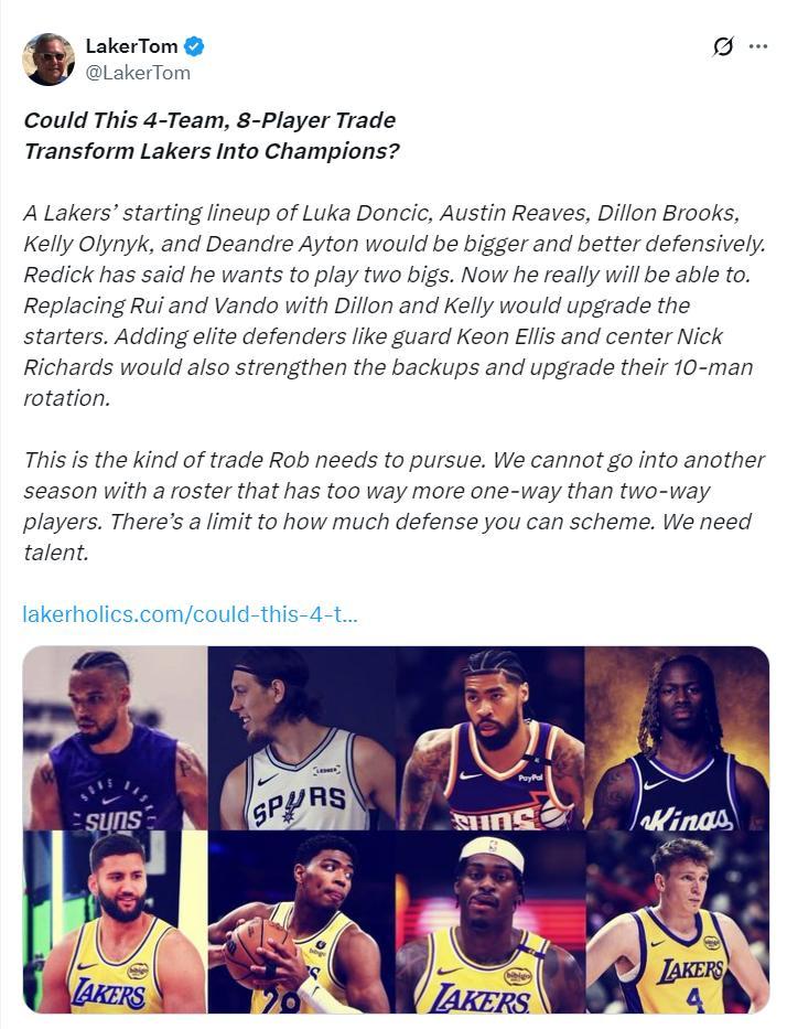 湖人媒體Laker Tom卻認爲這支湖人隊還是應該交易補強,大概率是覺得這套14+3名單根本沒有奪冠的可能性,他覺得進行一筆四方交易可以幫助湖人蛻變,他寫道:湖人應該繼續提升這支球隊的防守能力與尺寸,狄龍、奧利尼克、理查茲、埃利斯等人都是最好的補強。