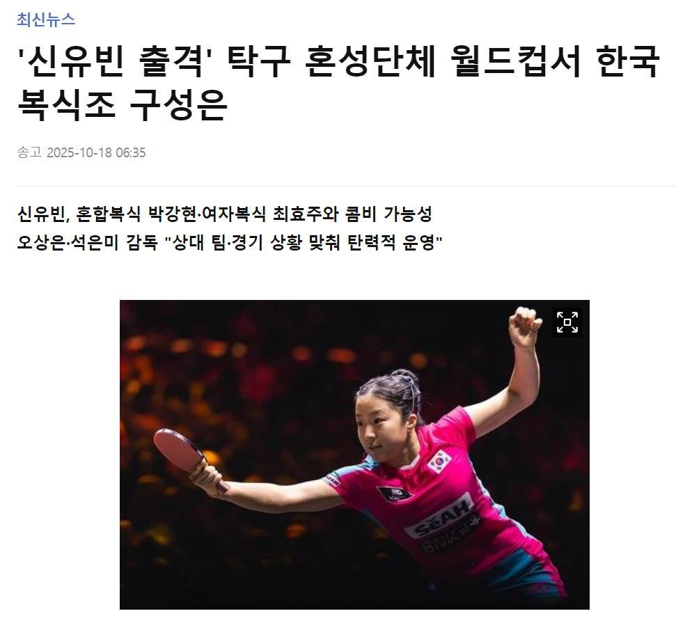 10月17日時韓國乒協公佈了2025年混合團體世界盃的大名單:男隊張禹珍、安宰賢、吳晙誠、樸康賢;女隊申裕斌、金娜英、李恩惠、崔孝珠,沒錯林仲勳、趙大成繼續落選了,那麼去年申裕斌的混雙搭檔就會有變化。