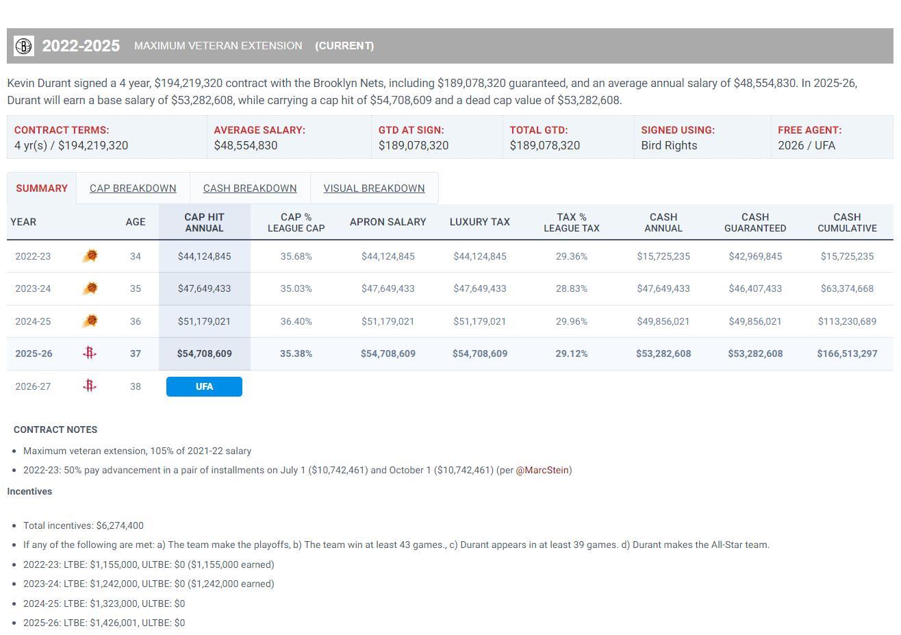 杜蘭特目前還剩25-26賽季價值5470萬的合同,換言之餘下三年杜蘭特還可以領取到1.447億美元的合同,三年的均薪依舊高達4823.3萬美元,這對於一個已經超過37歲的老將來說絕對不算低。