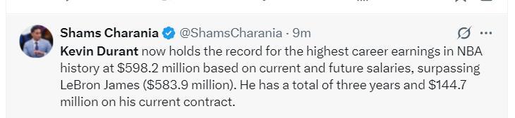 杜蘭特目前保持着NBA歷史最高收入紀錄,職業生涯總收入達到5.982億美元,基於當前及未來的薪資計算,他已經超過詹姆斯5.839億美元,他餘下三年的合同1.447億。