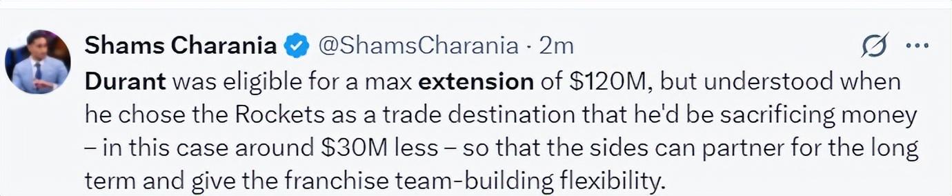 Shams跟蹤報道,杜蘭特原本有資格跟火箭達成一份兩年1.2億的頂薪提前合同,但他選擇火箭隊作爲交易目的地時就明白自己會犧牲一部分的收入,大約3000萬美元左右,這樣可以幫助火箭保留奪冠陣容,以便於跟球隊長期合作,火箭的未來空間也會更靈活。