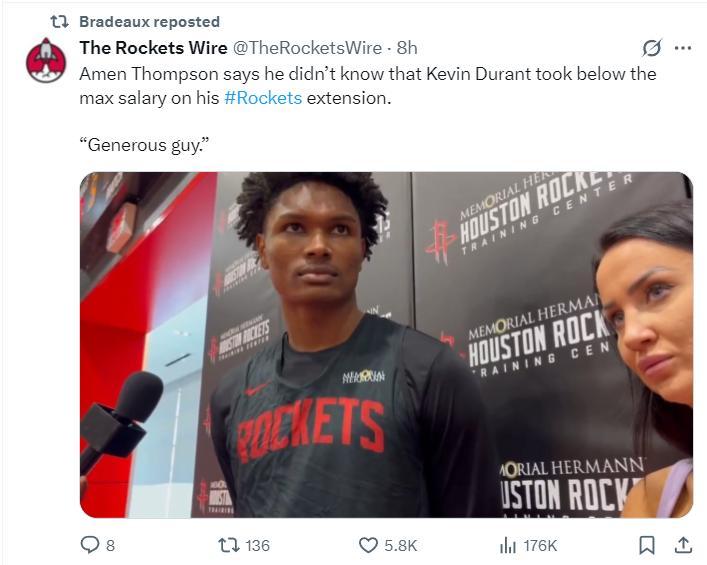 當阿門得知杜蘭特是降薪提前續約火箭時,阿門的反應是,這孩子太高風亮節了。