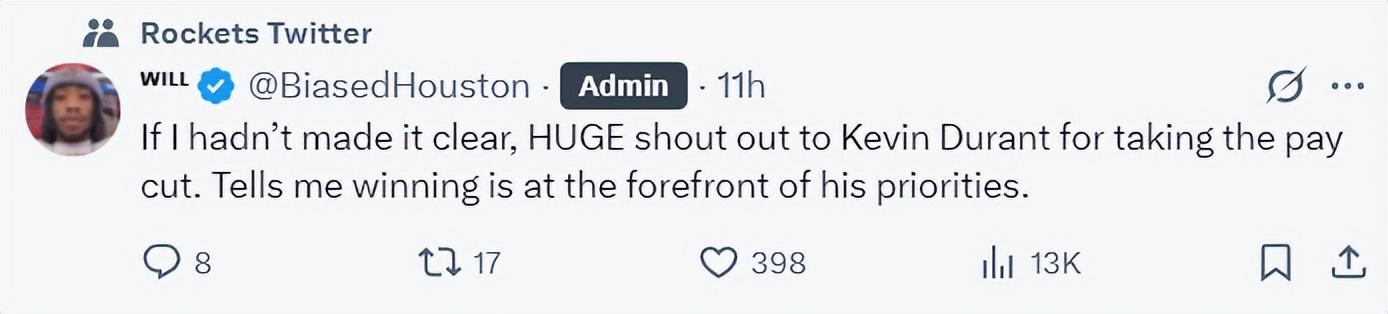 休媒發聲感謝杜蘭特:我要特別感謝凱文-杜蘭特願意降薪,這讓我明白對他而言贏得比賽是首要任務。