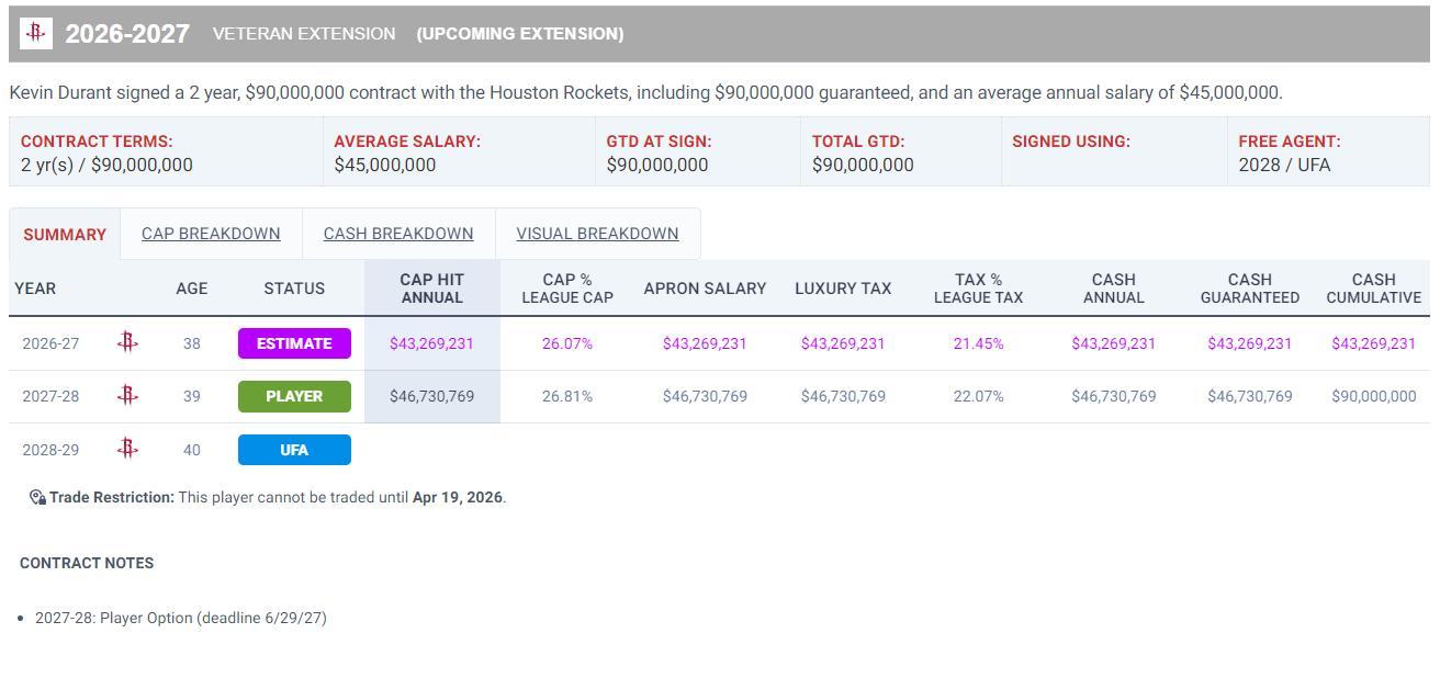 杜蘭特這份合同的細節,26-27賽季價值4326萬,27-28賽季4673萬(球員選項)。杜蘭特原本是可以跟火箭簽下一份兩年1.2億的頂薪合同,但他爲了幫助火箭保持薪金靈活選擇了降薪3000萬,杜蘭特願意爲了球隊做出犧牲。