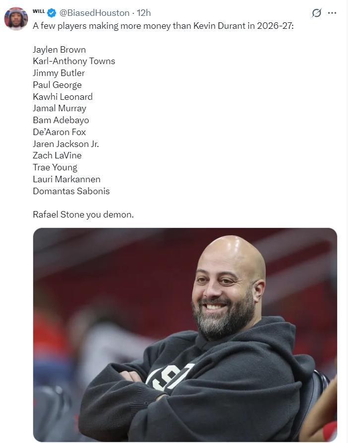 隨後休媒曬出26-27賽季薪水會超過杜蘭特的球員:杰倫布朗、唐斯、巴特勒、喬治、倫納德、賈馬爾穆雷、阿德巴約、福克斯、小賈倫傑克遜、拉文、特雷楊、馬爾卡寧、小薩博尼斯。(這13人有幾人能比KD強?)