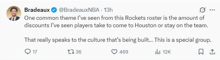 火箭記者Bradeaux寫道:從這支火箭隊的陣容中我們應該關注到一個點,很多球員爲了來到火箭或者留下火箭都做出了巨大的讓步,在薪水上做了諸多的犧牲,這反應了球隊正在形成的文化,這是一個特殊的羣體。