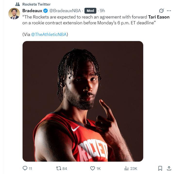 北京時間10月20日,根據TA兩位記者的聯合報道,休斯頓火箭隊將於當地時間週一(續約截止日期前)與塔裏-伊森達成提前續約。2022屆新秀的提前續約截止日期是北京時間10月21日6點。