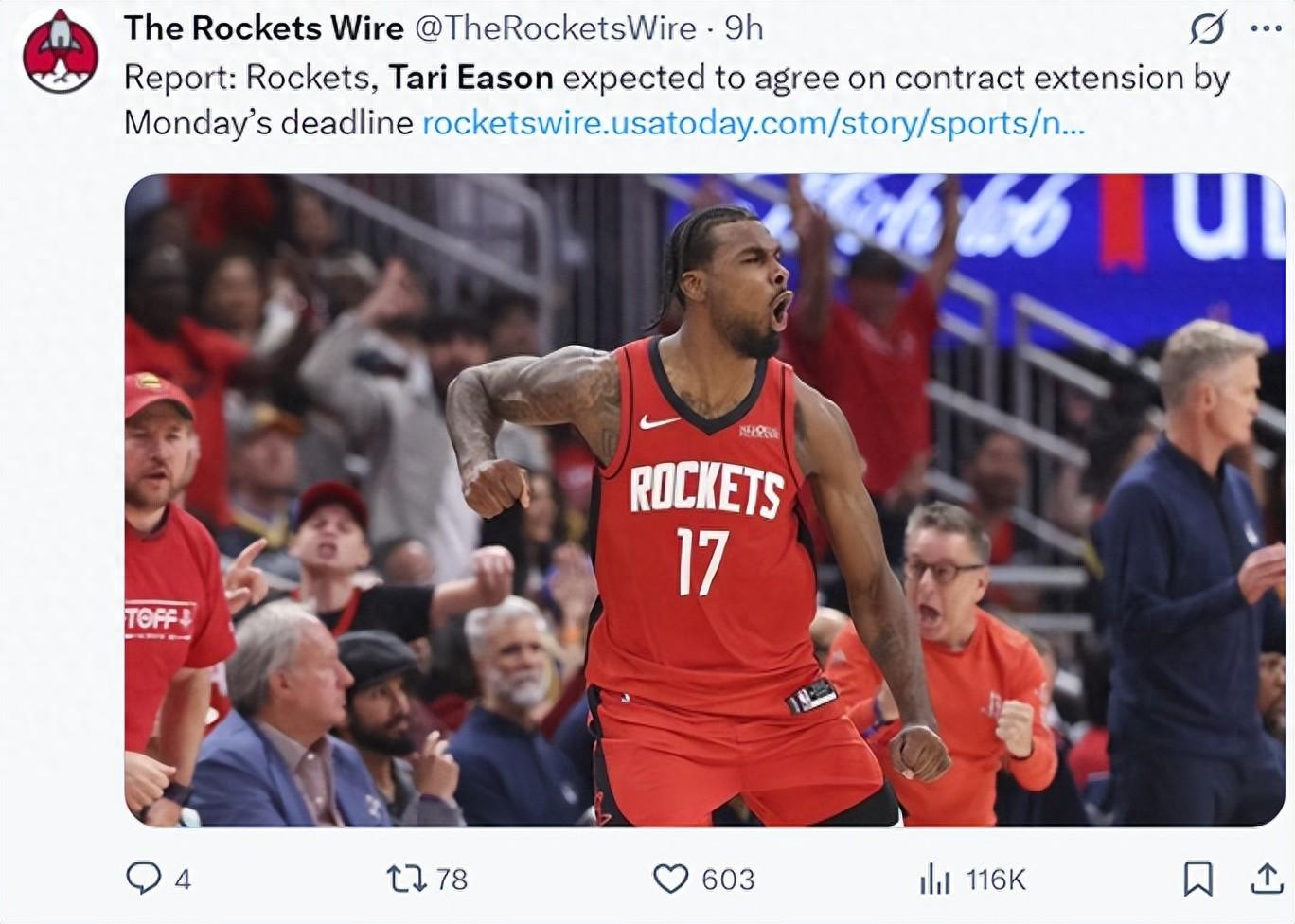 在幾小時前火箭隊官方剛剛宣佈已經跟杜蘭特達成了提前續約,這份合同是兩年9000萬,第二年是球員選項。火箭預留了2500萬的空間給伊森,目前應該是在商議具體的合同細節。