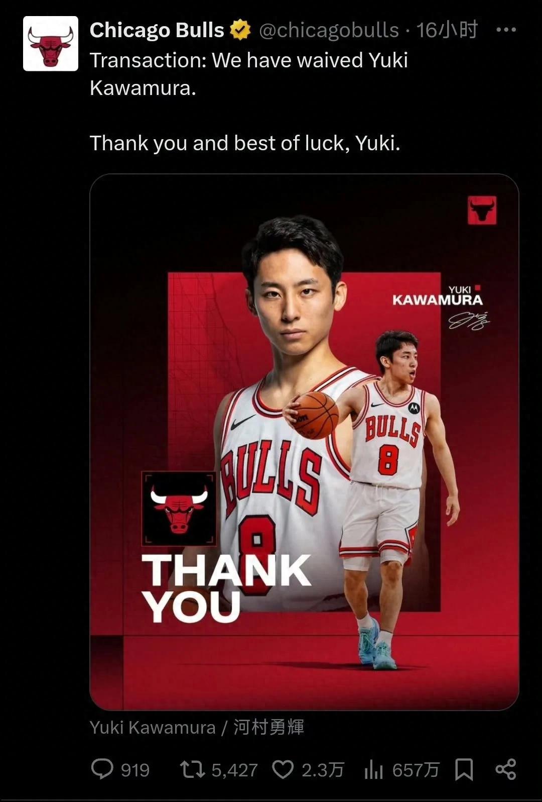 在NBA新賽季開始之前,芝加哥公牛隊裁掉了球隊的雙向球員河村勇輝。