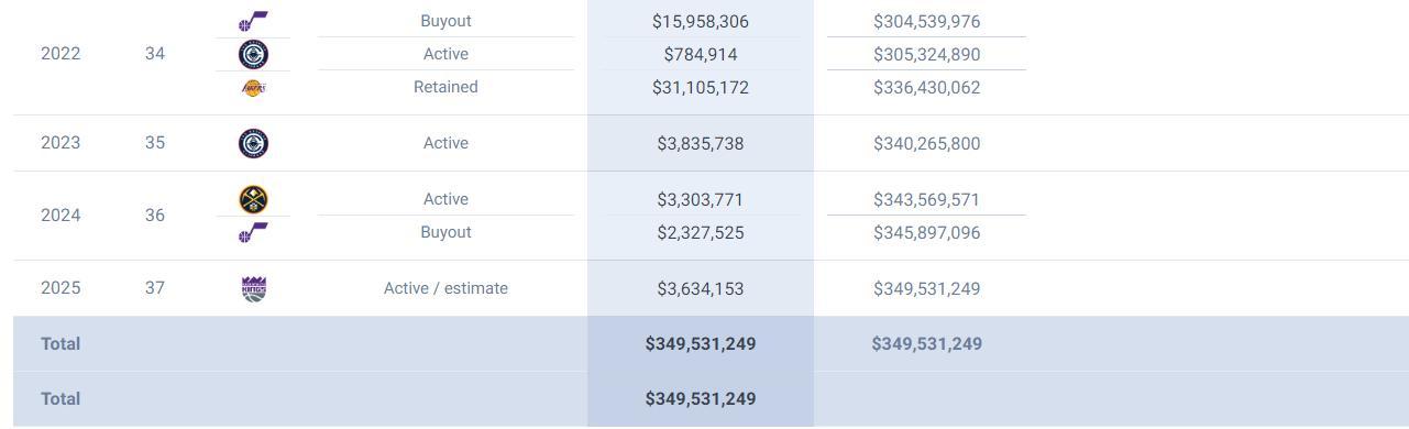 換言之從湖人離開後威少實際上賺到的薪水只有78萬+383萬+562萬+360萬(不保障),合計只有1383萬,這裏面還有360萬不知道能不能全額拿到,威少從一個年薪4000+萬的超巨淪爲聯盟的邊角料。