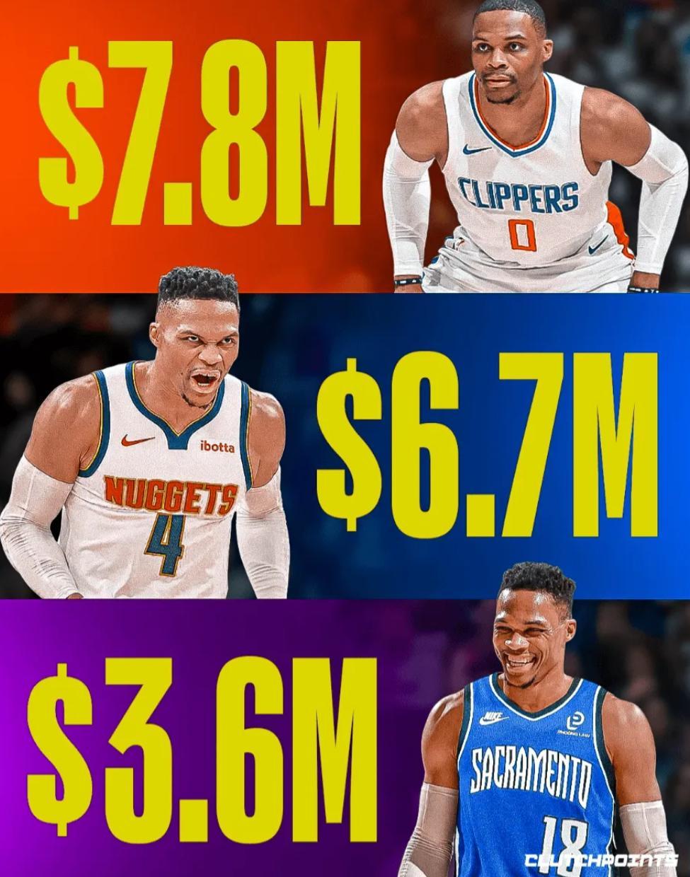 大家可以看看威少離開湖人後他的薪水下滑有多麼嚴重!22-23賽季他被湖人交易到爵士後遭到裁員,隨後威少以一年78萬的合同加盟快船,在快船打了半個賽季後2023年夏與快船簽下兩年780萬。