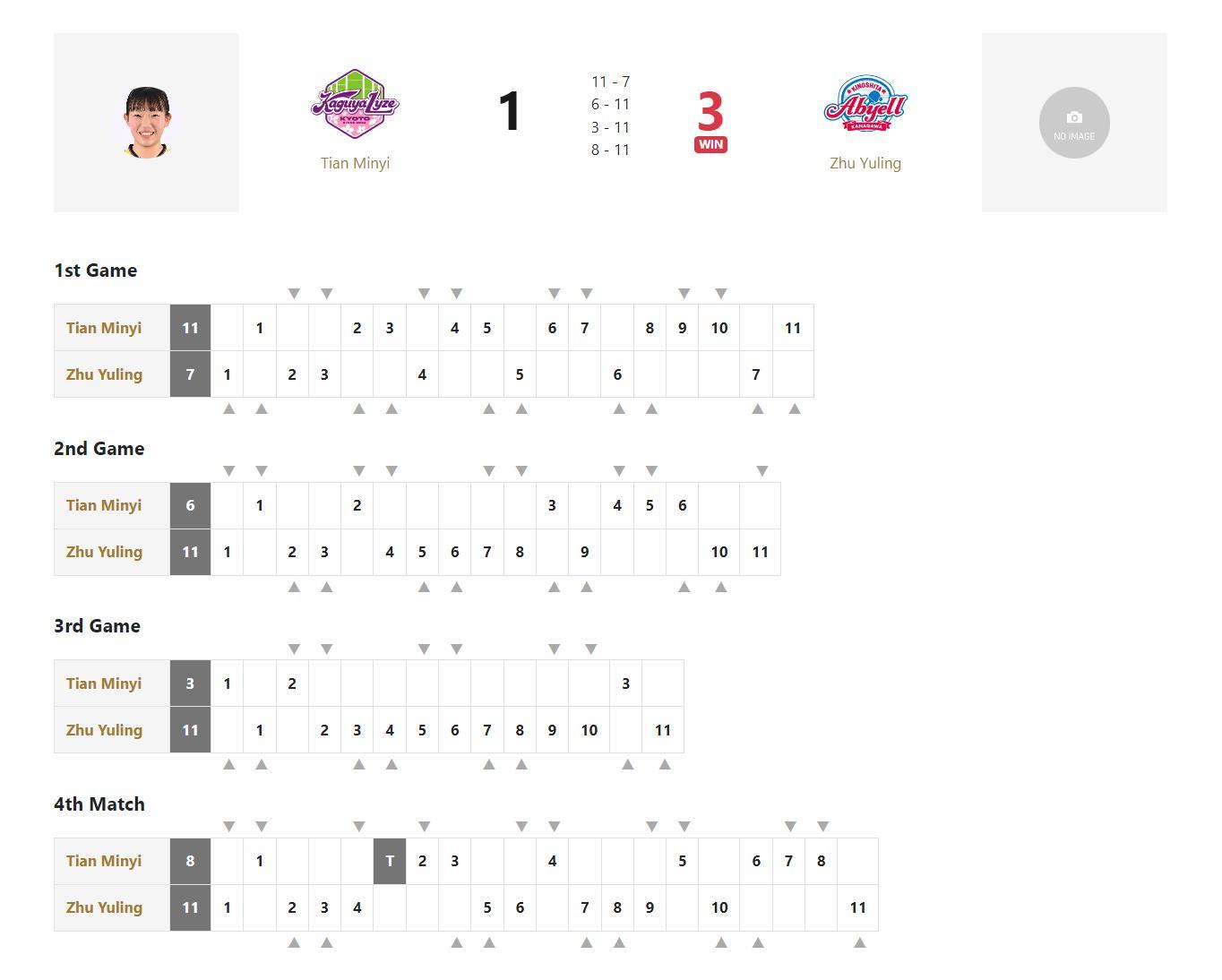 朱雨玲的首秀是10月12日對陣田旻一,朱雨玲是3-1擊敗田旻一,四局比分:7-11、11-6、11-3、11-8。可能是剛來T聯賽有些不適應,第一局就丟了,可隨後的三局都是一邊倒,這就是第六的強大統治力吧。