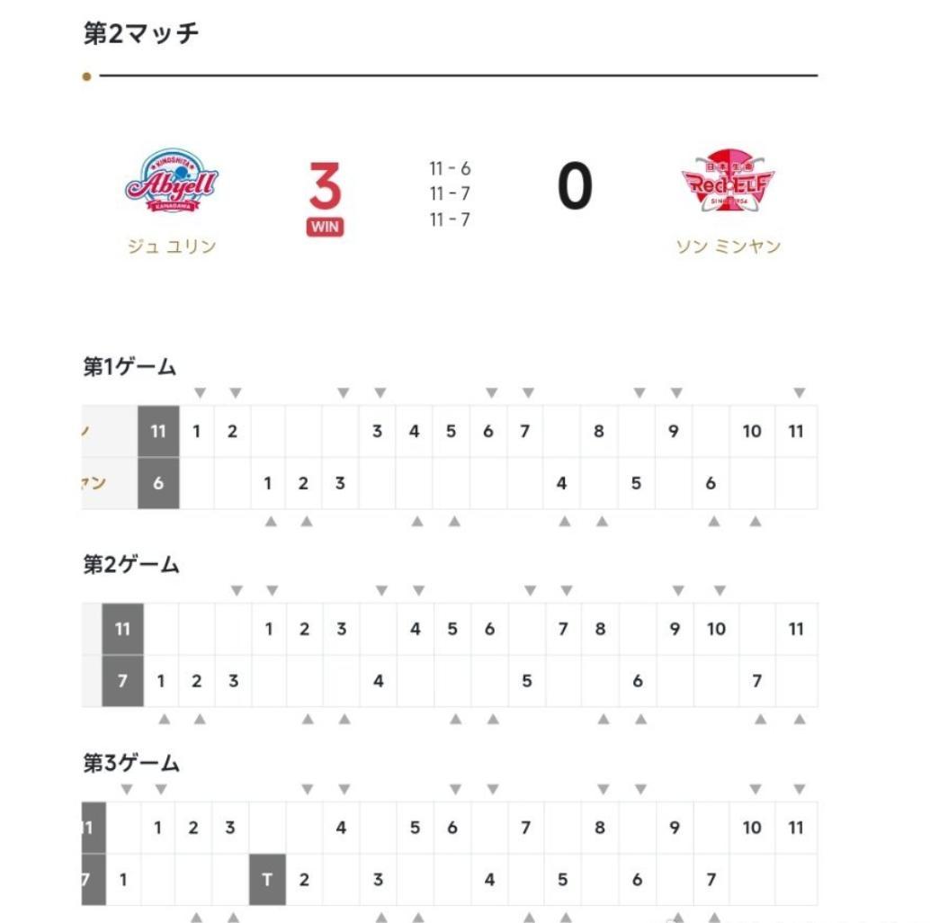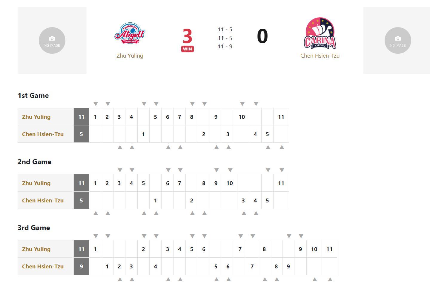 上一場木下神奈川的對手是九州,那場比賽朱雨玲的對手是鄭先知,最終也是3-0拿下勝利,三局比分11-5、11-5、11-9。第一局是10-3拿局點,第二局是10-2拿局點,只有第三局稍微膠着一點,兩人打到9-9。