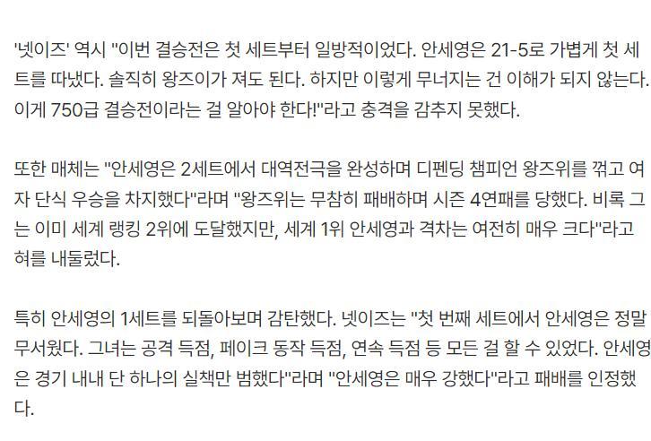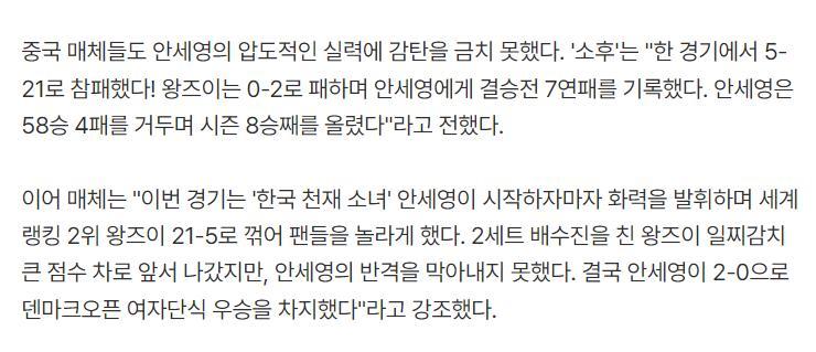 文中還寫道:中國媒體網易還寫道,這場比賽從第一局開始就是單方面的壓制,老實說王祉怡可以輸球,但無法理解開場就5-21崩盤,這可是女單決賽啊!安洗瑩第二局拿下勝利後成爲丹麥新王,衛冕冠軍王祉怡就這樣慘敗了,雖然王祉怡是世界第二可與世界第一的安洗瑩實力差距巨大。