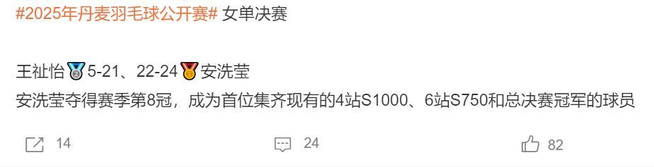 在2025年丹麥公開賽上,國羽獲得1金3銀的成績,馮彥哲/黃東萍混雙奪冠,王祉怡女單亞軍,石宇奇男單亞軍,蔣振邦/魏雅欣混雙亞軍。
