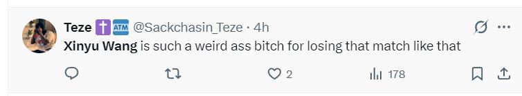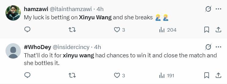 這場比賽王欣瑜也是多次跟裁判抱怨,因爲她出戰的一號場地,沒有電子線審也沒有鷹眼設施,關鍵球也不給回放,王欣瑜在決勝盤的情緒非常的低落。最終她遭遇了單打6連敗,再一次淪爲了外國球迷炮轟的對象。