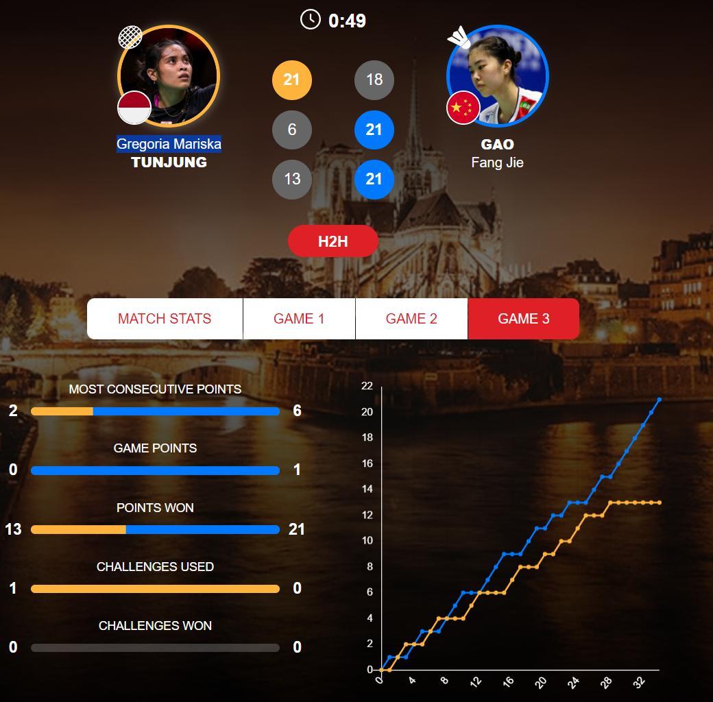 第三局開場兩人非常膠着,從1-1鏖戰到6-6,轉折點就是高昉潔連拿3分9-6反超後,隨後高昉潔15-13繼續領先,打到這裏瑪麗斯卡的心態明顯開始失衡,她的自失開始增加,高昉潔趁勢打出6-0的攻勢直接帶走比賽21-13。