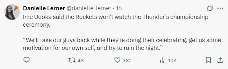 在頒獎儀式開始前,火箭全隊紛紛退場,烏度卡在採訪中明確表態:我們不會參與他們的總冠軍頒獎儀式,趁他們在慶祝的時候我們會進入更衣室,我們要給自己一點動力,儘量搞砸他們的頒獎典禮。