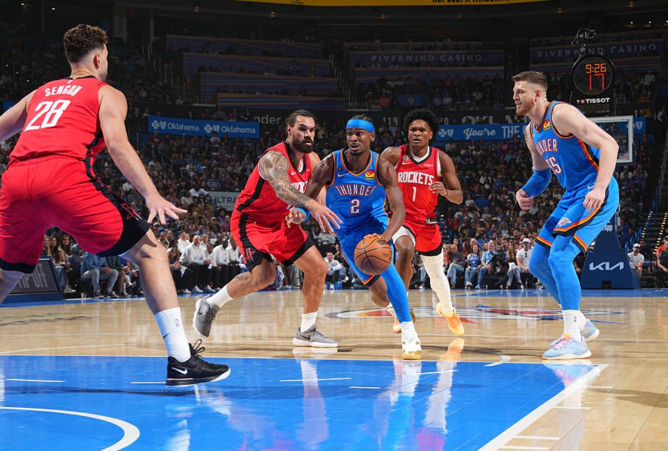 北京時間10月22日,NBA揭幕戰火箭VS雷霆,這場比賽之前雷霆也進行了總冠軍頒獎儀式,上半場打完火箭57-51領先雷霆。