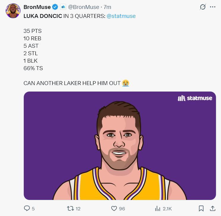第三節湖人是崩盤的一節,可這一節全隊25分有13分是東契奇一人所得,單節9中6拿13分3籃板1助攻1搶斷,三節打完已經拿到35+10+5的數據。